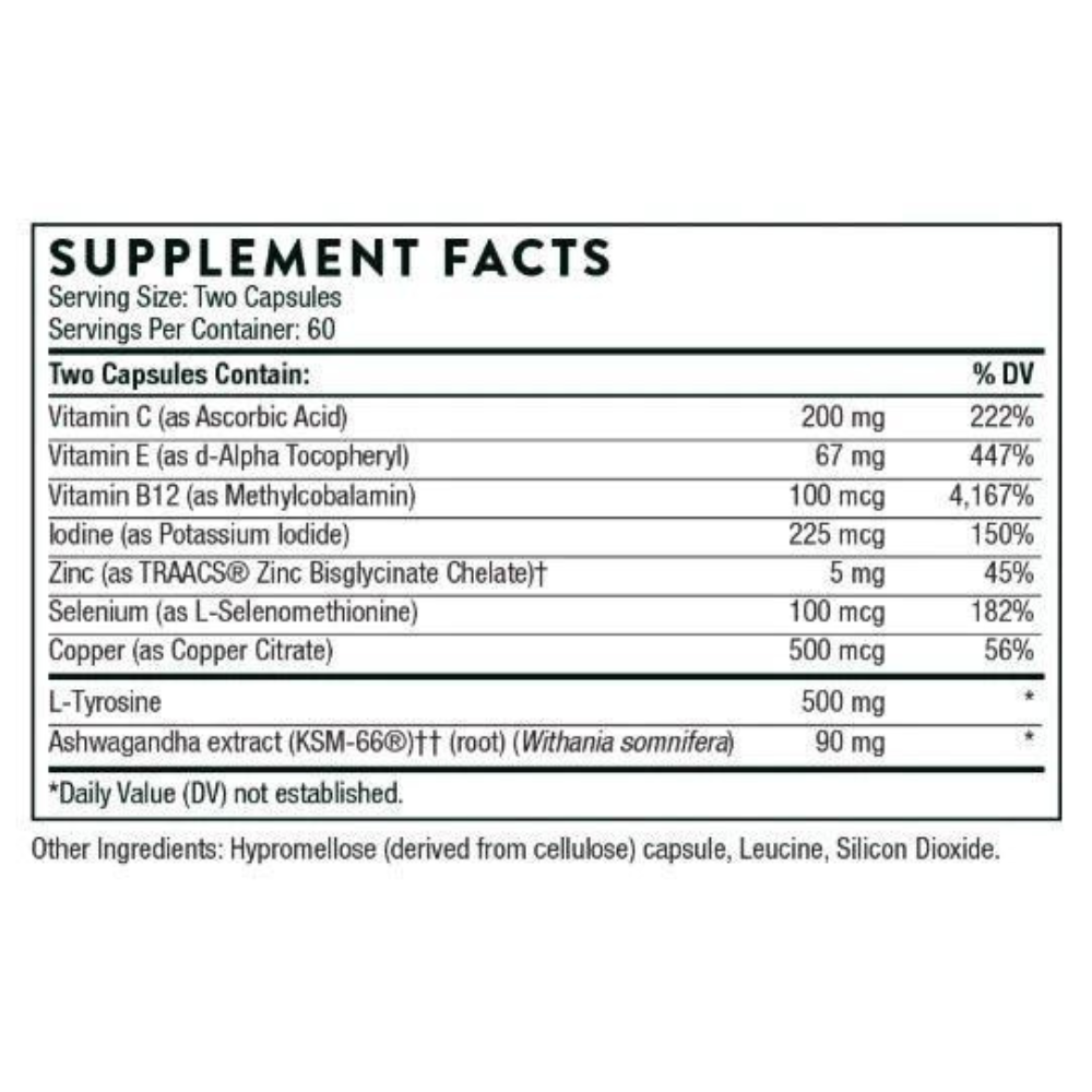 Thorne’s Thyrocsin formula contains key ingredients for thyroid support, including iodine, which is necessary for formation of T4, and L-tyrosine, which is a necessary component of both T4 and T3 formation.* Animal studies have indicated that the Ayurvedic botanical, ashwagandha, can increase T4 concentrations.* Thyrocsin also includes several nutrient cofactors necessary for converting T4 to T3, including the minerals selenium, zinc, and copper.* Thyrocsin includes vitamin B12 because a deficiency of this vitamin appears to interfere with the activity of thyroid hormones.* Conversion of T4 to T3 can be inhibited by heavy metal toxicity and lipid peroxidation; hence, the inclusion of antioxidant vitamins C and E to counterbalance this inhibition.*